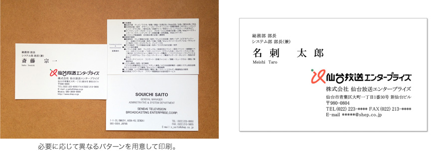 日常の名刺交換では、お渡しする相手に合わせて、異なる名刺を用意するのはよくあること。仙台放送エンタープライズでも、裏面に“営業案内”を付けたり、英文表記を入れたり、複数のパターンを用意しているが、外注だと100枚単位でしか注文できないので、バリエーションが増えるとコスト増になるし、使い切らない余分な名刺も増えてしまう。しかし、カードプリンターなら、名刺の種類が増えても必要な枚数だけ印刷できるので、コストの心配も不要だし、名刺を捨てるムダも出ないというわけだ。
