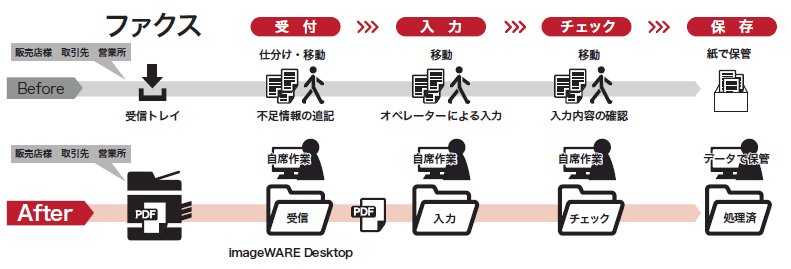 また、お客さまからのファクス注文に関する対応についても課題があった。「どのオペレーターが、どのお客さまの注文を、どこまで処理しているかが把握できないので、問い合わせがあった場合、オペレーターに声をかけ、作業の手を止めてもらって注文書を探していました。問い合わせ対応に相当の時間が割かれていました。」と松本は語る。その他にも、注文書の紛失リスク、証憑保存スペースの確保など紙のファクスならではの課題があった。