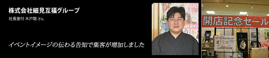 イベント開催時に、垂れ幕を店舗の外に向けて提示。インパクトの大きいPR活動をすることで集客率がアップ株式会社 細見互福グループ