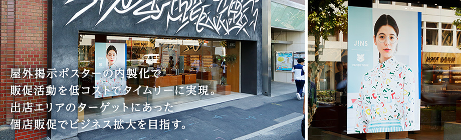 今後は、新規出店予定地に掲出する「近日オープン」や「オープニングスタッフ募集」といった掲示物など、幅広い用途での利用も考えているそうです。「こうした制作物は地味になりがちですが、特にロードサイド店舗では、前を通りすぎる人の目を引くのが重要です。これからは耐水メディアも活用すれば、JINSのブランドイメージに沿った掲示物で強くアピールできるはずです」と黒澤氏は話します。