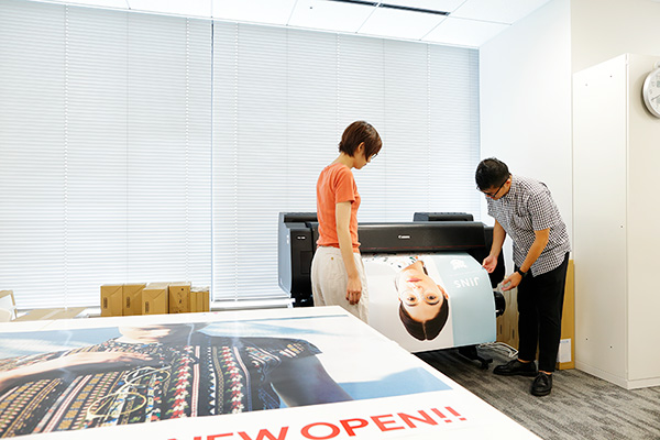 2018年6月に「imagePROGRAF PRO-4000」は東京本社に搬入され、運用が開始されました。「最初のテスト印刷から、期待以上に高画質なポスターが出力されて驚きました。動作音も小さく安心して作業できます」と宮下氏は話します。印刷速度や2段ロール給紙機構で用紙交換の負担が少ないことも評価しているとのこと。気になるコスト削減効果については、従来と比べて約10分の1の費用でポスター制作が可能になったそうです。