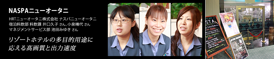 NASPAニューオータニは、ネイチャー&スポーツ・パーソナルエリアの略語NASPAが示す通り、大規模な会議室・宴会場と、プール・テニスコート・プライベートゲレンデを併せ持つ高級リゾートホテルである。大判出力は、館内の5つのレストランやエステティックサロンなどのポスターや、団体客への館内の案内表示や会議室利用時のサービスに活用されている。実際にご使用になられている宿泊料飲部の井口氏、小泉氏と、マネジメントサービス部の池田氏に話を伺った。