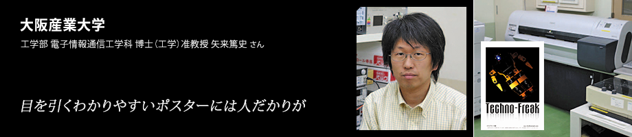 大阪産業大学・東部キャンパスの10号棟に、工学部・電子情報通信工学科の実験室や研究室がある。同学科では電気電子の研究を通じて、現代社会のニーズに対応できる技術者を育てる教育に取り組んでいる。昨年12月、同学科では5階事務所にimagePROGRAFを導入。大判プリンターを活用している同学科准教授の矢来篤史氏に、理数系学科でのimagePROGRAF運用の実際と利用効果について話を伺った。
