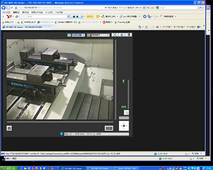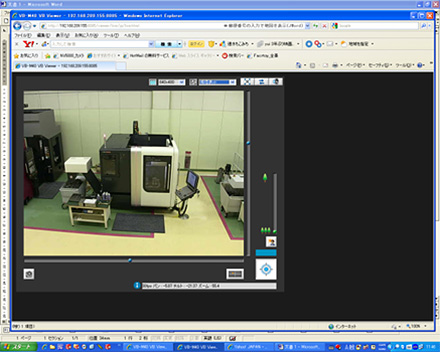 工場内と工作機械内にカメラを設置、加工の様子(映像と音声)を全国に配信するインフラを構築しました。工場内のカメラは工作機と作業者全体の様子を撮影し、工作機械内のカメラは加工している様子を撮影しています。