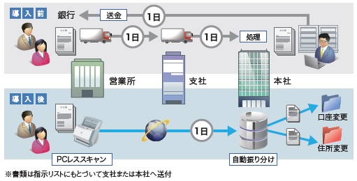 では、具体的な導入効果としてはどんなことが挙げられるのでしょう。実際にシステムを利用する岩田氏は次のように語ります。 「最も効果が大きいのは、営業所の次工程となる支社や本社の事務削減です。書類をまとめてスキャンした段階で書類や業務の種類まで識別できているので、例えば、口座変更担当の人はそこだけを見に行けばいいんですね。感覚としては、今まで3日かかっていたものが、2日に短縮されるイメージでしょうか。書類が届き、チェックをして、紙をさばいてといった作業がパソコン一台で完結し、仮に書類に不備があってもその書類はまだ現地にとどまっているため、事務担当者からの指示ですぐにお客さまのところに持っていって修正することが可能になったのです」。 大きく業務効率アップにつながった今回のシステム導入ですが、もう一つ見逃せない導入効果が、お客さまサービスの向上だと齋藤氏は語ります。