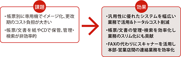 幅広い業務にシステムを活用し、手形・小切手、相続関連書類、融資稟議書をはじめとする帳票・文書の保管スペース削減、検索の効率化を実現し、業務時間の短縮、業務のスリム化に貢献している。