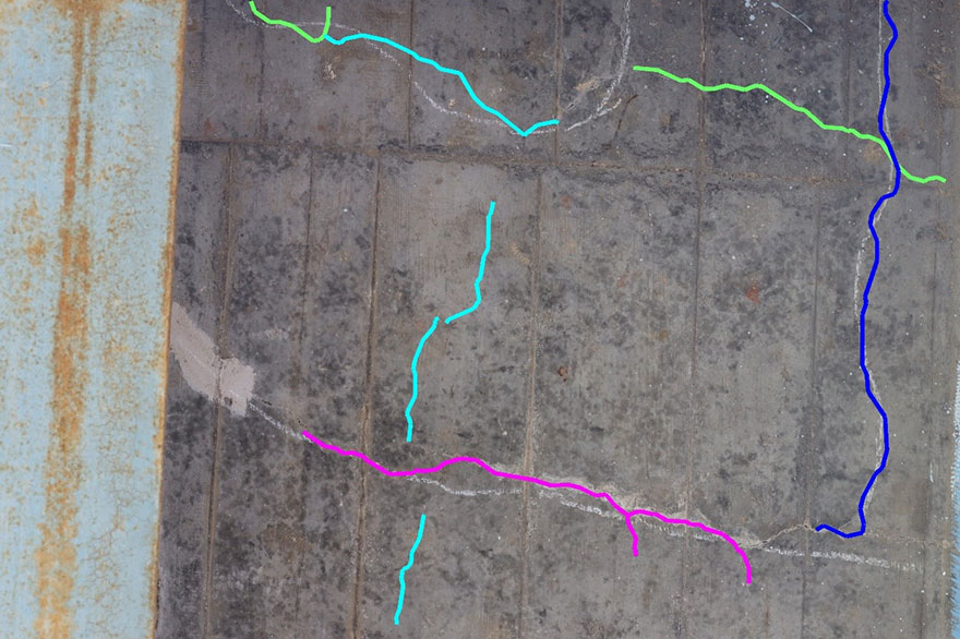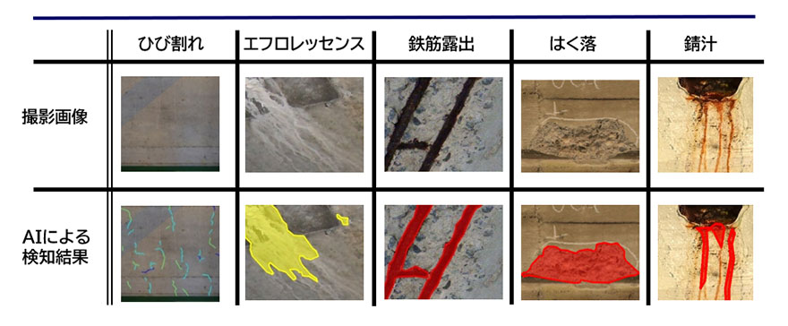 ひび割れ、エフロレッセンス、鉄筋露出、はく落、錆汁の検知