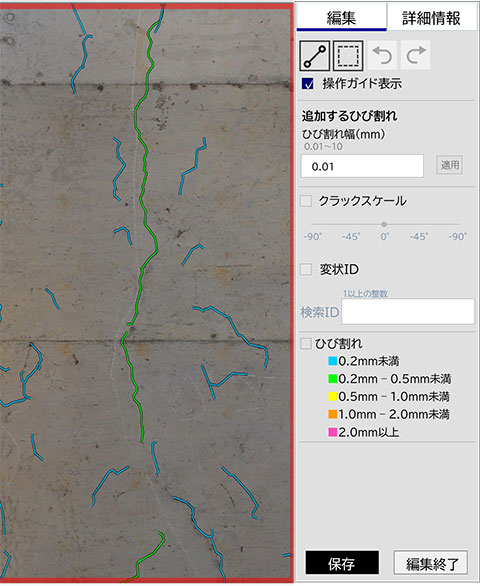 AI検知後の修正(誤検知、検知漏れ)や、追加、延長、連結、幅補正が可能