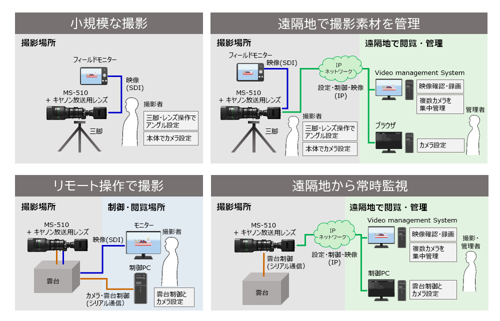 カメラを直接操作する小規模な構成や、シリアル通信によるリモート制御を行う構成、IPネットワーク通信による遠隔地からの制御を行う構成などが可能です。