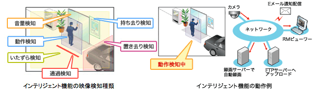 キヤノン独自の背景差分方式により、動体検知、持ち去り検知、置き去り検知、いたずら検知、通過検知のインテリジェント機能を実現。検知領域は、多角形による指定にも対応し、検知パターンと組み合せることで、精度の高い検知を行うことが可能。また、音量レベル検知にも対応し音による異常事態を検知可能。イベント検知をきっかけに映像のアップロードやイベント通知が可能。