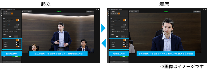 着席/起立動作を検出して、着席時にはズームし、起立時には全体が映るように表示サイズを補正します。