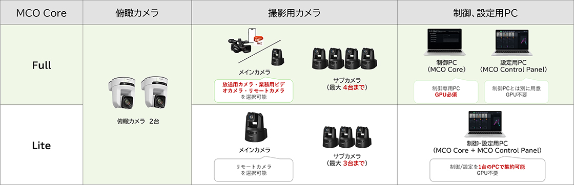 MCOを使用するためには、俯瞰カメラ2台、撮影用カメラ、制御/設定用のPCがそれぞれ必要です。MCOを制御するPCアプリケーション(MCO Core)にはFULL版/Lite版の2種類のライセンスがあり、それぞれ使用可能な機器構成や、機能・精度が異なります。
