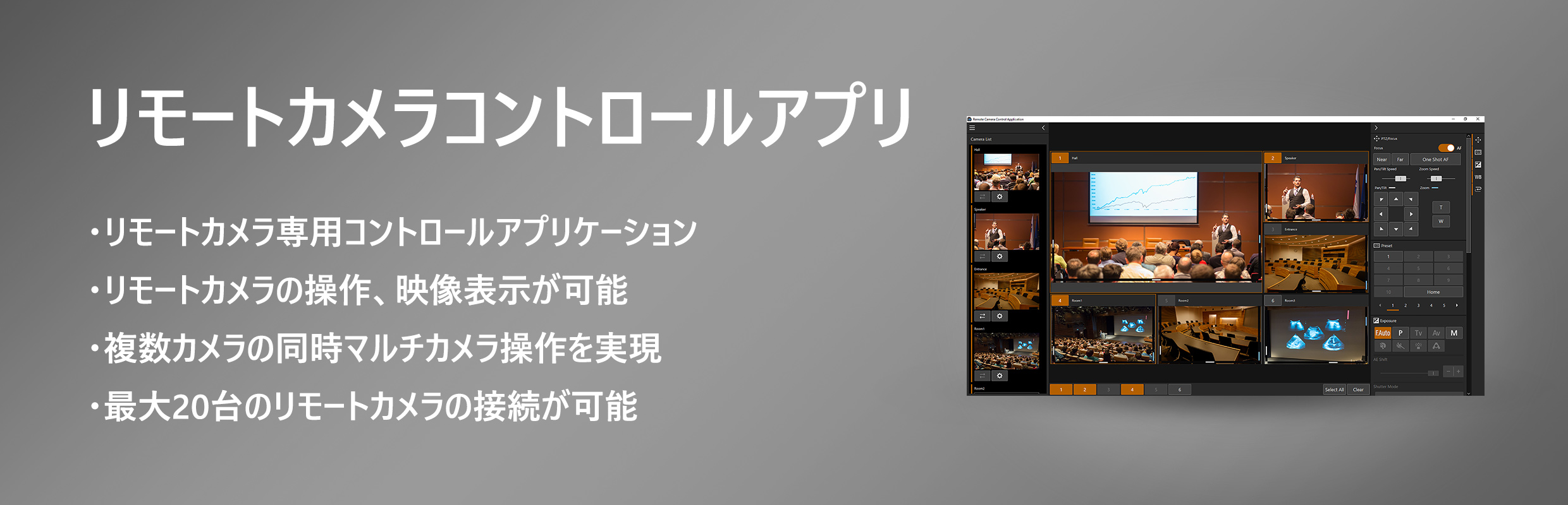 リモートカメラコントロールアプリ リモートカメラ専用コントロールアプリケーション リモートカメラの操作、映像表示が可能 複数カメラの同時マルチカメラ操作を実現 最大20台のリモートカメラの接続が可能