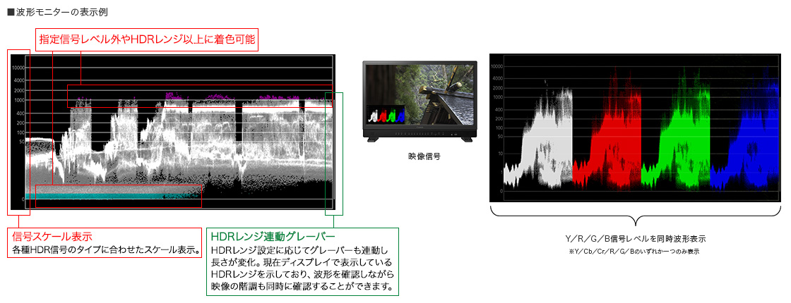 波形モニターは、各種HDR信号(PQ/HLG/Log信号)に応じたスケール表示ができます。また、ユーザーが指定した信号レベル外やHDRレンジ以上の部分を着色表示することができます。HDR制作において、HDR信号の輝度レベルを各方式に沿って最適に表示ができ、輝度レベルを視覚的に確認することができるため、 HDR映像確認の質が向上し、効率化に繋がります。