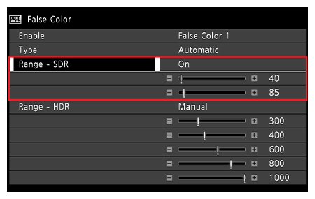 SMPTE ST 2084(PQ)やHybrid Log Gammaの入力信号の輝度に応じて、異なる色を着色して表示。HDRレンジに応じて色分けする輝度範囲を自動調整できるほか、SMPTE ST 2084(PQ)とHybrid Log-Gammaの異なる2種類の輝度範囲を設定し、シーンに応じて使い分けることが可能です。また、HDR領域とSDR領域の輝度境界の設定(100/200cd/m²)や、SDR領域を異なる2種類の色で色分けするなど、輝度範囲をより柔軟かつ簡単に設定・確認できます。