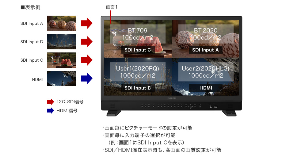 12G/6G/3G/HD-SDI信号とHDMI信号の4K/2K映像信号を1台のディスプレイで2画面/4画面表示※することができます。撮影現場でSDI端子搭載カメラとHDMI端子搭載カメラを併用する場合、入力切替や信号変換器などを不要とし、1台の4Kディスプレイで確認ができます。