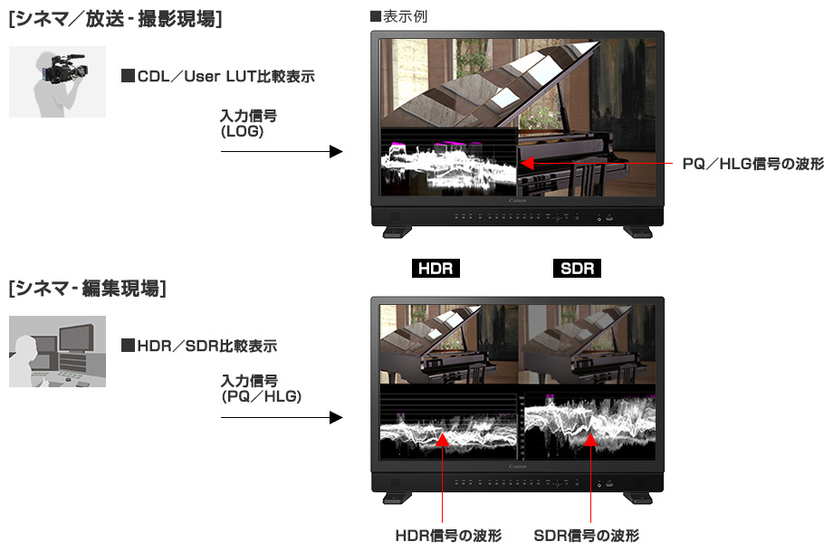 専用の波形モニタと同じように入力映像と各種機能を同一画面上に表示することで、ディスプレイ1台で映像と信号情報が効率的に同時確認ができ、撮影現場での利便性が向上します。