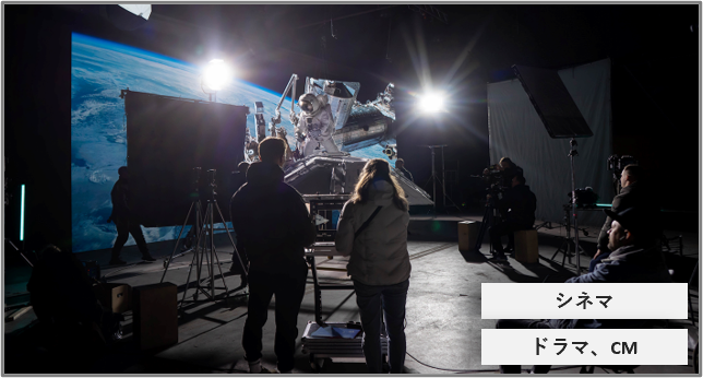撮影後にデジタル効果を追加していたVFX(Visual Effects)での映像制作に対し、バーチャルプロダクションでは、コンピュータで生成した3Dの背景やキャラクターを大型のLEDスクリーンにリアルタイムで表示して撮影します。