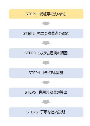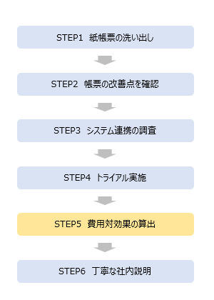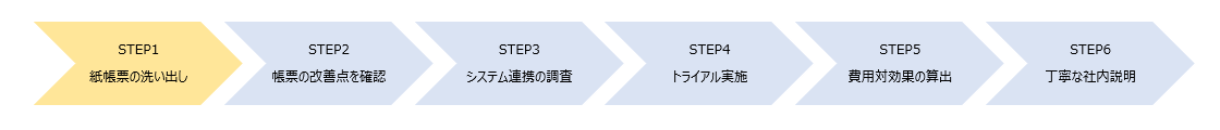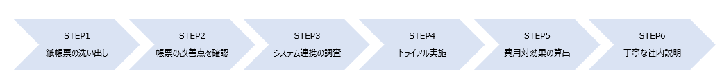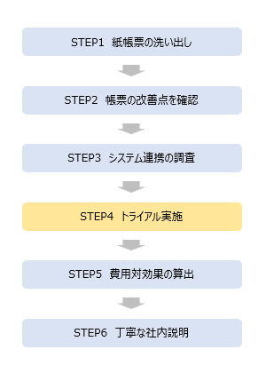 期待された効果が本当に得られるかを確認するためにトライアルを実施ます。トライアルの際は現在の紙帳票で行っている場合に掛かっている業務時間を予め算出し、電子帳票で行う場合に掛かる業務時間をトライアルから得ることが重要です。トライアルはITリテラシーの高い低いでそれぞれメンバーを選出することをおすすめします。また、電子化によるメリットには印刷コスト、保管コスト、検索時間、移動時間、紛失・欠損リスクの削減などもありますので、効果測定項目として盛り込んで下さい。