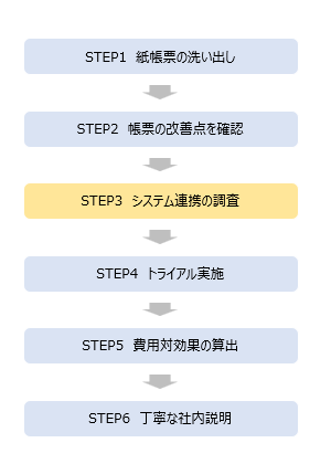 電子帳票のデータを社内システムと連携する必要があるかないか、必要な場合はその可否を調査します。システム連携にはAPIやCSV等が考えられますが、システムによってはデータ入出力がオプションで別途費用の掛かるものがあります。CSV入力が可能なシステムであれば、そのCSVフォーマットを用意できれば連携可否の判断が可能です。CSV入力不可のステムでもRPAなどで転記作業を自動化できる可能性があります。