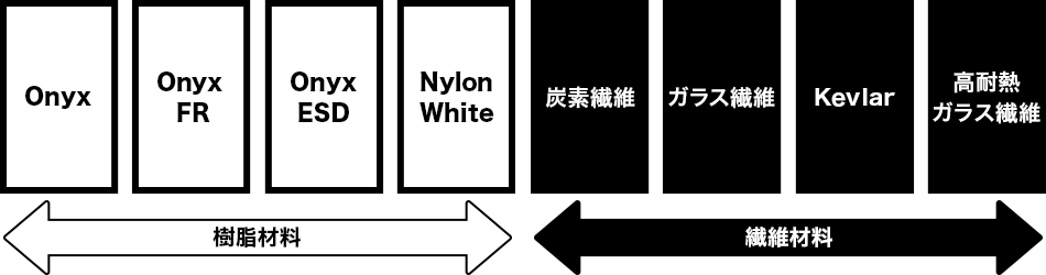 Markforged社独自の造形プロセスより、繊維材料の3Dプリントは2種類の材料の組合わせから造形されます。樹脂材料が表面を覆い、繊維材料が内部構造を強化します。