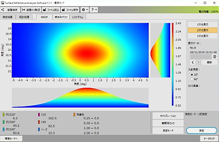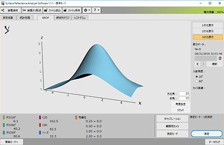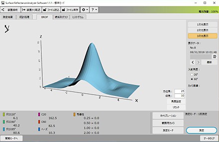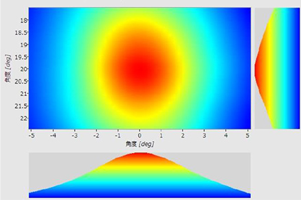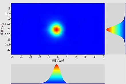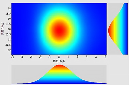 本測定装置では受光角20°あるいは60°に対して、正反射およびその近傍で測定された反射光強度の角度分布を取得することができます。