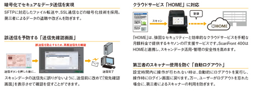ScanFront 400は、堅牢なセキュリティ機能を備えている。まず誤送信による漏洩を防ぐために、送信前に「宛先確認画面」を表示させることが可能。また、設定時間内に操作が行われない時は自動的にログアウトする仕様となっている。このほか、強固なセキュリティと効率的なクラウドサービスを手頃な月額料金でキヤノンが提供する「HOME」にも対応しているため、会員登録業務で個人情報を扱う際にも安心して使える仕様となっている。