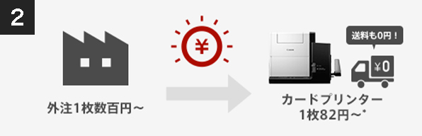 キヤノンは1枚インクコスト約2円※~。外注するより安いのはもちろん、一般的な昇華型方式のカードプリンターよりも、低コストでプラスチックカードがつくれます。