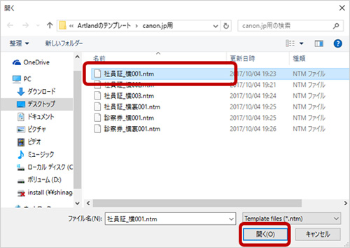 7.1でダウンロードしたテンプレートファイル(.ntm)を選択し、[開く]ボタンをクリックすると登録完了です。