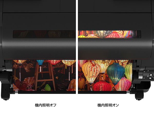 本体カバー内にはLEDの機内照明を装備。カバーを閉じた状態で印刷中の様子を見ることができ、ミスプリントによるインクや用紙のムダを削減するのに役立ちます。照明の点灯状態は、パネルのホーム画面から簡単に切り替えられます。