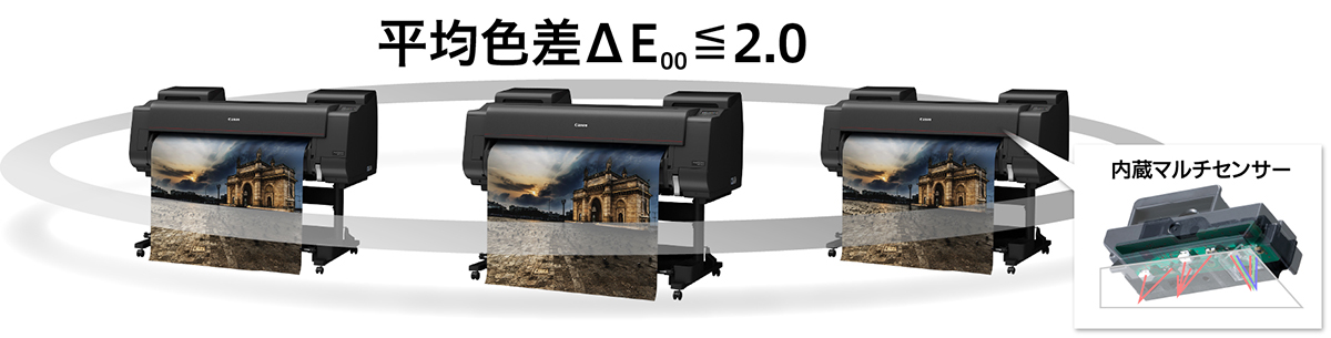 下記の測定条件・方法によるものです。平均色差⊿E₀₀は、印刷内容や環境などによって変わります。 1)温湿度環境、使用する用紙の種類を同じとし、当社純正インクを用いて同一機種プリンター2台にキャリブレーションを実施。 2)キャリブレーション終了後、引き続いて2台のプリンターそれぞれでパッチチャート(729パッチ)を同一種類の当社純正紙に印刷。使用ドライバーは「imagePROGRAFプリンタードライバー」。 3)印刷したパッチチャート2枚を温度23℃、相対湿度60%の環境において十分乾燥させた後、単一の測色器にて測色。各パッチにつき2枚のパッチチャート間の平均⊿E₀₀を算出。