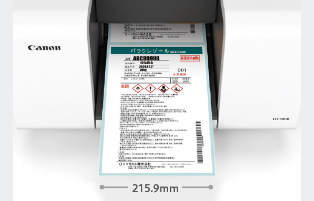 最大215.9mm(8.5インチ)幅のラベル出力に対応。これまで外注印刷に頼っていた大型のカラーラベルの手配を、1枚から内製化することが可能です。商品の魅力や情報をわかりやすく効果的に伝えたい大型の商品ラベルはもちろんのこと、大型容器へのラベル貼り付けが必要な、化学薬品等で使用されるGHSラベルの作成にも適しています。