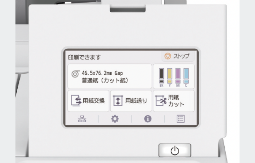 角度調整が可能なチルト機能を備えた4.3インチのカラータッチパネルを搭載。ホーム画面で用紙カットや用紙交換などの基本的な動作指示はもちろんのこと、ロール紙やインクの残量も確認できます。また基本的な操作方法をイラストやアニメーションで表示するため、視覚的に分かりやすくプリンターを操作することが可能です。
