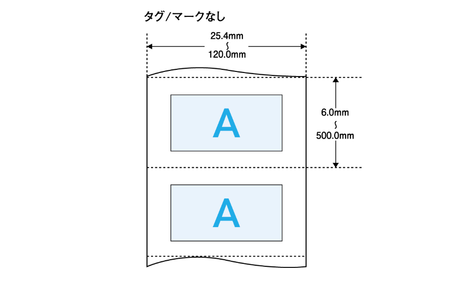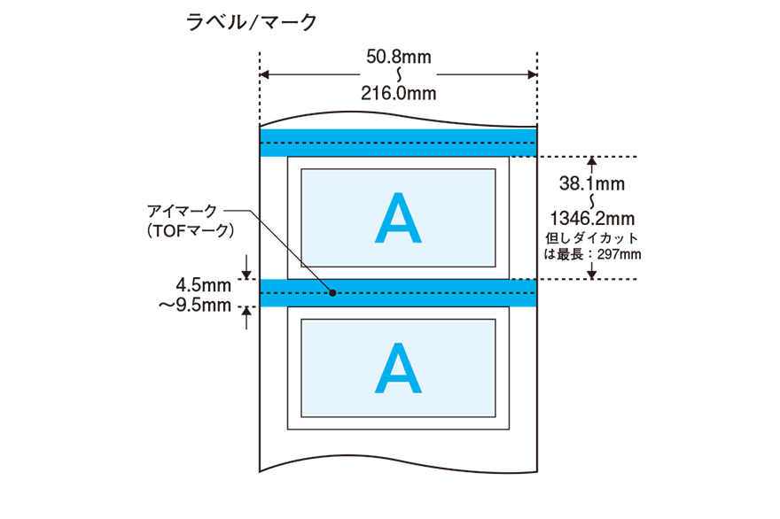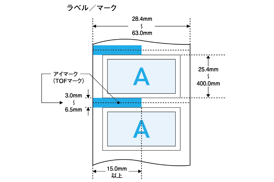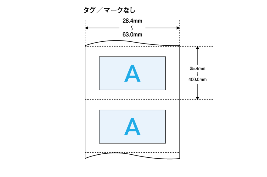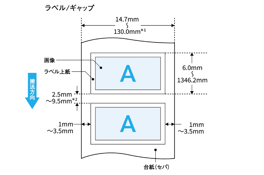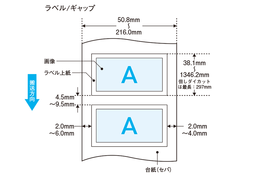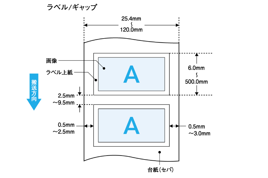 オートカッターユニット使用の場合は、ラベルサイズ(幅×長さ)やラベル間ギャップが異なります。