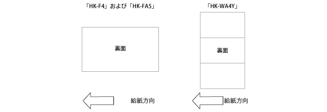 手差しトレイを使用する場合、用紙「HK-F4」および「HK-FA5」は横に向けて裏面を上にしてセットします。用紙「HK-WA4Y」は縦に向けて裏面を上にしてセットします。
