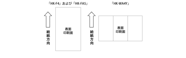 手差しトレイを使用する場合、用紙「HK-F4」および「HK-FA5」は縦に向けて表面を上にしてセットします。用紙「HK-WA4Y」は横に向けて表面を上にしてセットします。