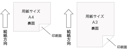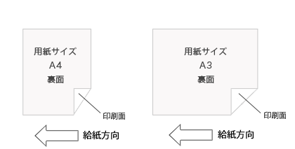 A3サイズの用紙は縦送りになります。用紙を横に向けて印刷面を下にしてセットします。