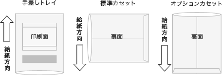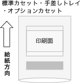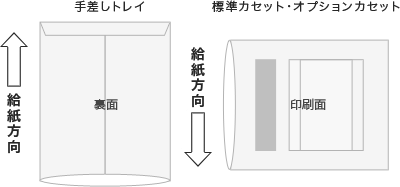 オプションカセットを使用して縦送りする場合、薬袋開口部を給紙方向とは反対(向かって左)に向けて、印刷面を上にしてセットします。また、横送りする場合、薬袋開口部を向かって奥に向けて、印刷面を下にしてセットします。