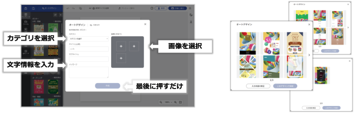 アプリケーションがデザインを自動でご提案!デザインに悩む必要もなく、簡単にデザインを始められます。