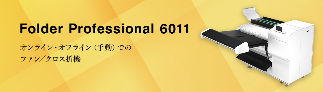 Folder Professional 6011はクロス折りでA4仕上げ対応の折機で、A4のカット紙も自動回転し図面の向きを揃えてスタックします。オンライン・オフラインでのファン/クロス折りに対応。折らずに出力した図面を手動給紙して折るオフラインモードの双方に対応しています。クロス折りはA4からA0サイズの図面に、長尺は2.5mまで対応(A4仕上げ/210mm)。ファン折りは6mの長尺に対応します。プリンタドライバで各折りパターンの制御が可能です。