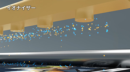 上質紙やコート紙など抵抗の低い用紙には用紙の表面、裏面両方からイオナイザーにより+と-のイオンを発生し中和させ除電します。