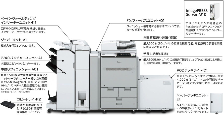 | imagePRESS Server M10V2.0 | 3836C009 | 950,000円 | 7,500円 | アドビシステムズ社純正のPostScript 3ソフトウェアを搭載したプリントコントロールサーバー(本体背面に取付け)。PostScriptアプリケーションを使用するユーザーや、大量のプリントを必要とするオフィス環境に最適なオプションです。※2 | |