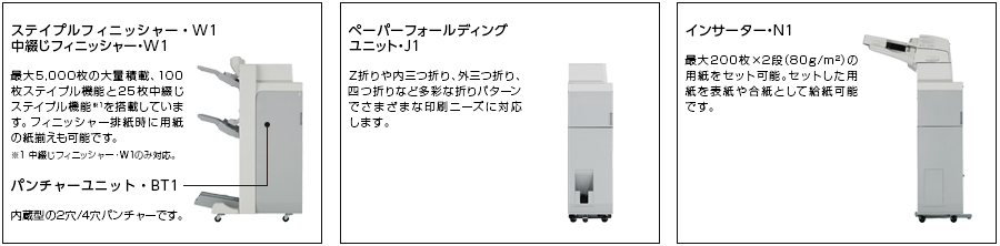 | 中綴じフィニッシャー・W1 | 0118C001 | 1,050,000円 | 5,000円 | 最大 5,000枚(80g/m2)積載。コーナー綴じ(100枚)、ダブル綴じ(100枚)、中綴じ(25枚)が可能。取付にはバッファーパスユニット・Q1及びアクセサリーインターフェイスキット・A1が必要です。 |