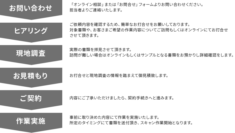 対象文書や仕様、スキャン後の工程までお客さまのご要望に合わせご提案いたします。