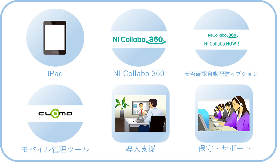 安否確認デジタル化パックは、NI Collabo NOW!を活用し、タブレットの位置情報と現在地の画像を撮影・保存することで、自動的に安否確認が行われるソリューションです。