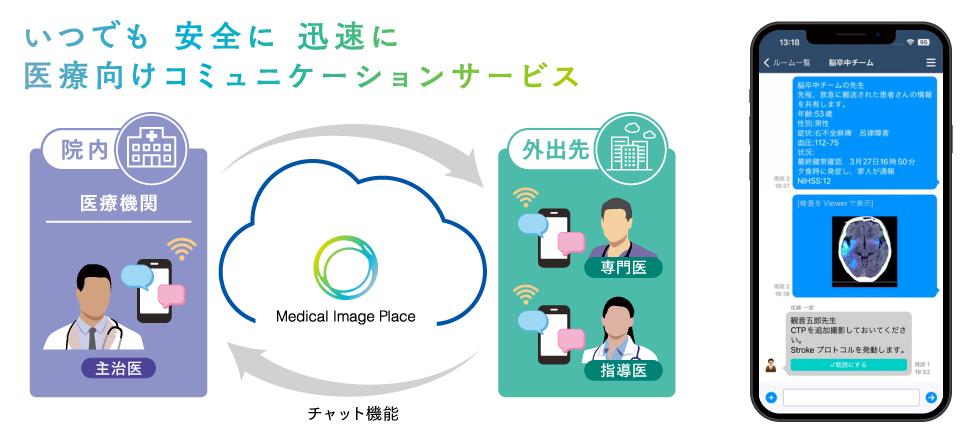 「Medical Image Place モバイル画像参照サービス」と連携も可能で、チャットと医用画像をセキュアな環境で医療従事者間の効率的かつ安全な情報共有を実現します。
