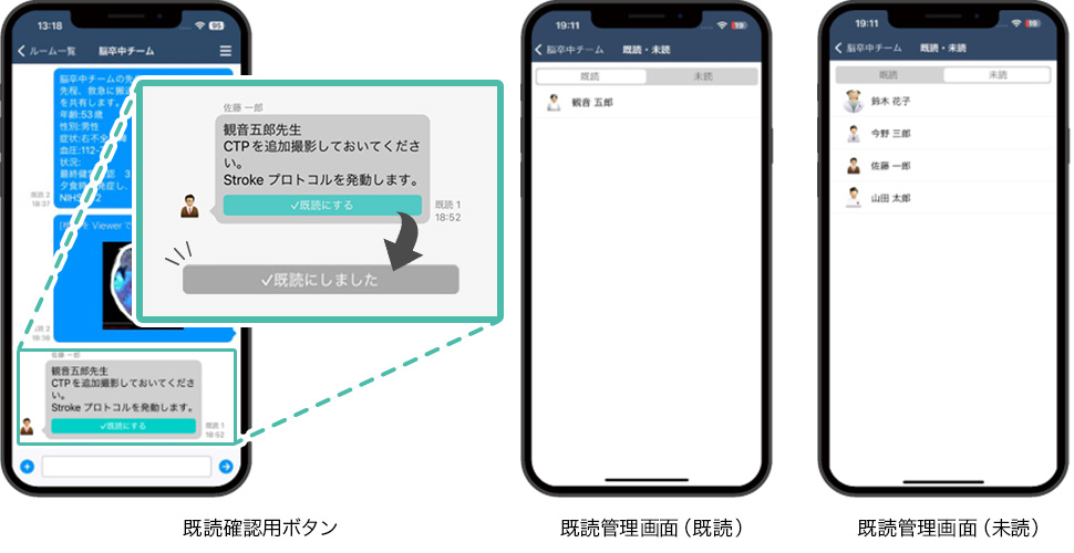 情報伝達をより確実に行うための既読管理機能です。発信者が既読確認機能をONにして発信すると、受信者に既読確認用ボタンが表示されます。受信者は、ボタンを押下することで内容を確認済であることを発信者に通知し、発信者はメッセージが確実に届いたことを確認することができます。また、既読確認者の状況を、一覧で確認することも可能です。