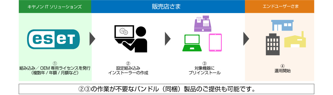 ESET製品は、お客さま独自の製品/システム/サービスでもご利用いただけるよう「組み込み/OEMビジネス」を展開しています。製品バンドル、プリインストール、キッティング、月額オプション販売など、お客さまのご要望に合わせて柔軟に対応します。