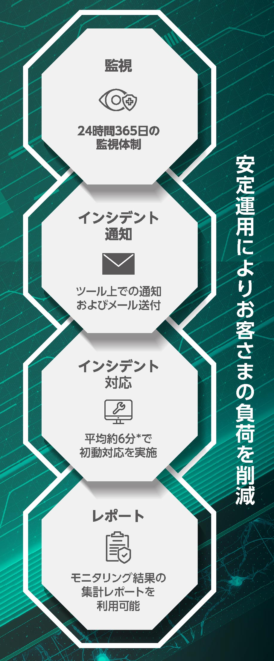 24時間365日体制で脅威を監視し、万一侵入が発生した場合には、AIなどを活用した自動化システムとセキュリティエンジニアによる対応により、脅威の封じ込めなどの初動対応を平均約6分※で実施します。
