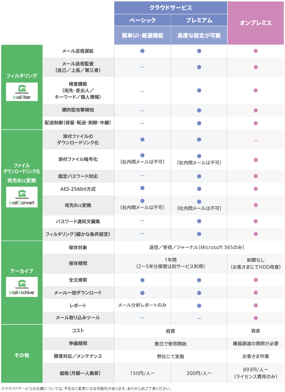 - 「アーカイブ保管サービス」ご利用の場合は、「MailArchive on Cloud ベーシック」または「MailArchive on Cloud プレミアム」と同数のご契約が必要です。
